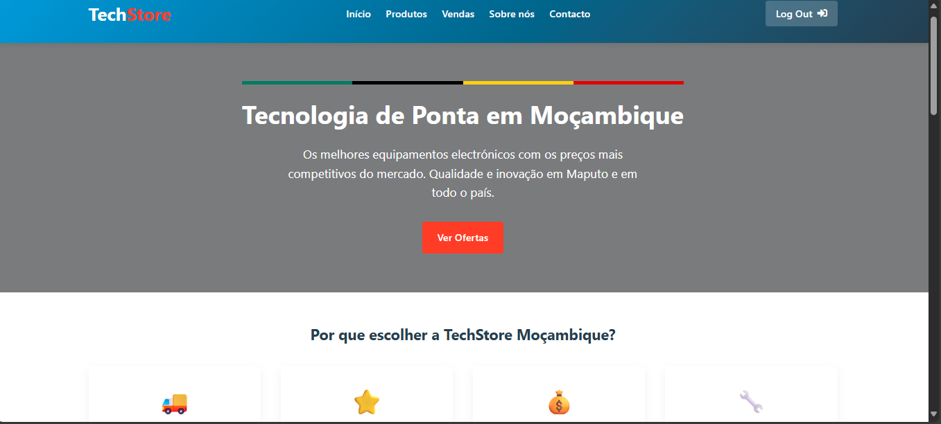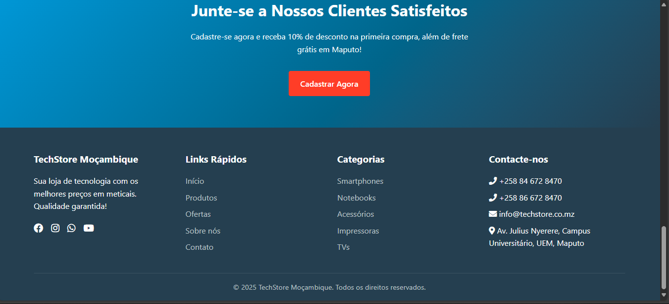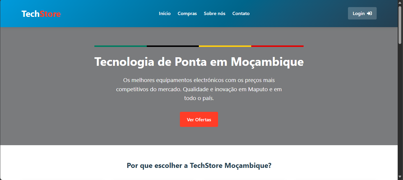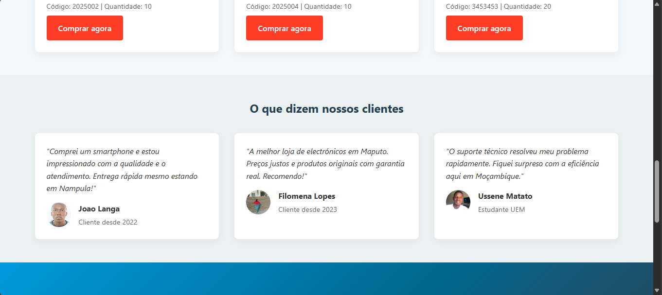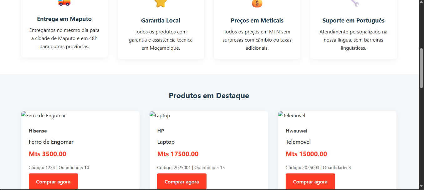 Web application developed to enable fast and secure purchases of electronic products. The platform provides a smooth and responsive browsing experience, with integrated payment methods such as M-Pesa, E-Mola, and bank cards. The system is designed to ensure user convenience, transaction security, and efficiency throughout the online shopping process.